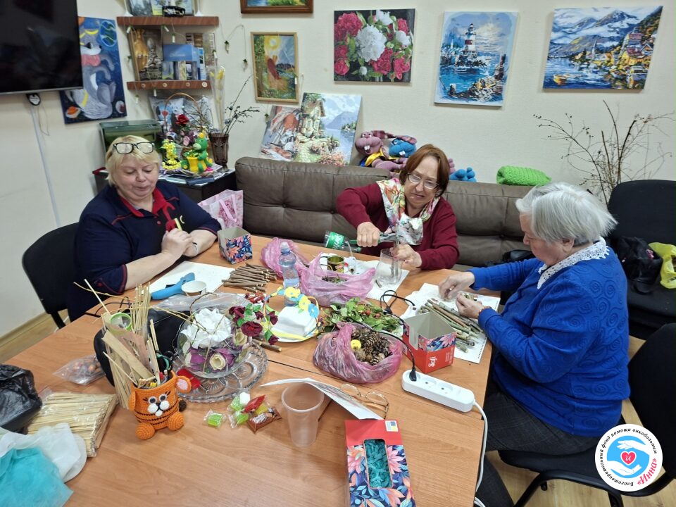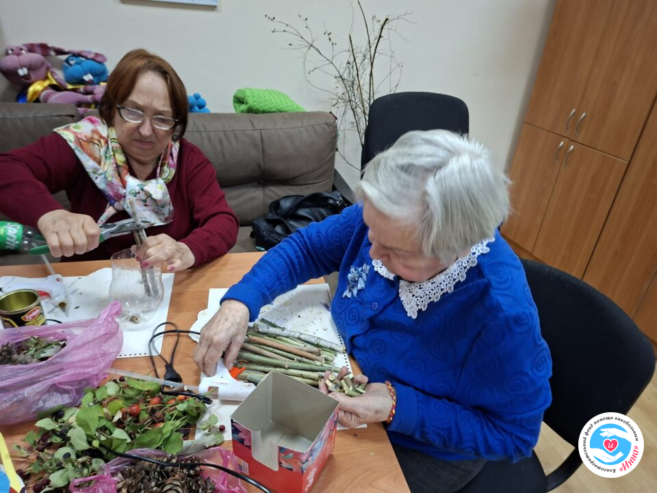 На очередном занятии по арт-терапии подопечные Фонда занимались изготовлением экибаны (или икебаны). Так называется древнее японское искусство компоновки природных материалов, в первую очередь, живых и сухих цветов, веточек, шишек, мха, а также разных минералов и даже камней.