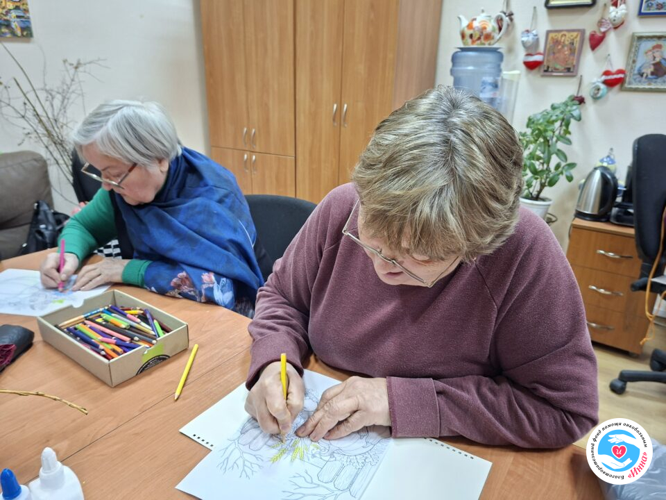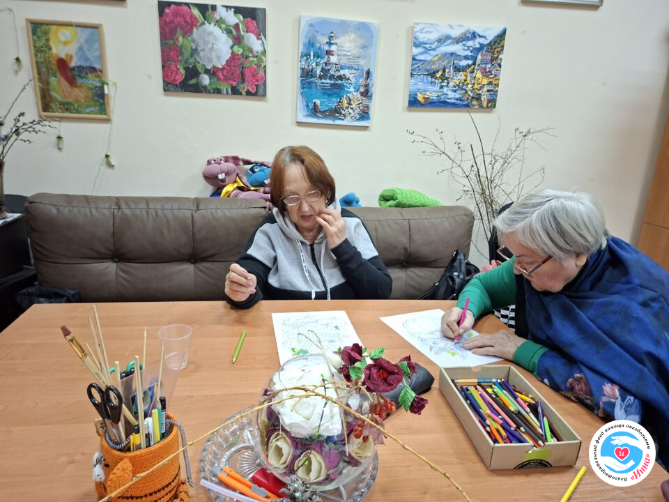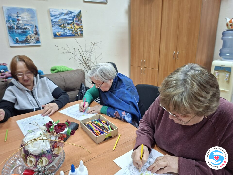 На плановому занятті з арт-терапії підопічні Фонду займалися розфарбовуванням картинок. Такий вид занять дуже подобається учасникам, оскільки можна проявити свою фантазію і зробити свій малюнок оригінальним, незабутнім.